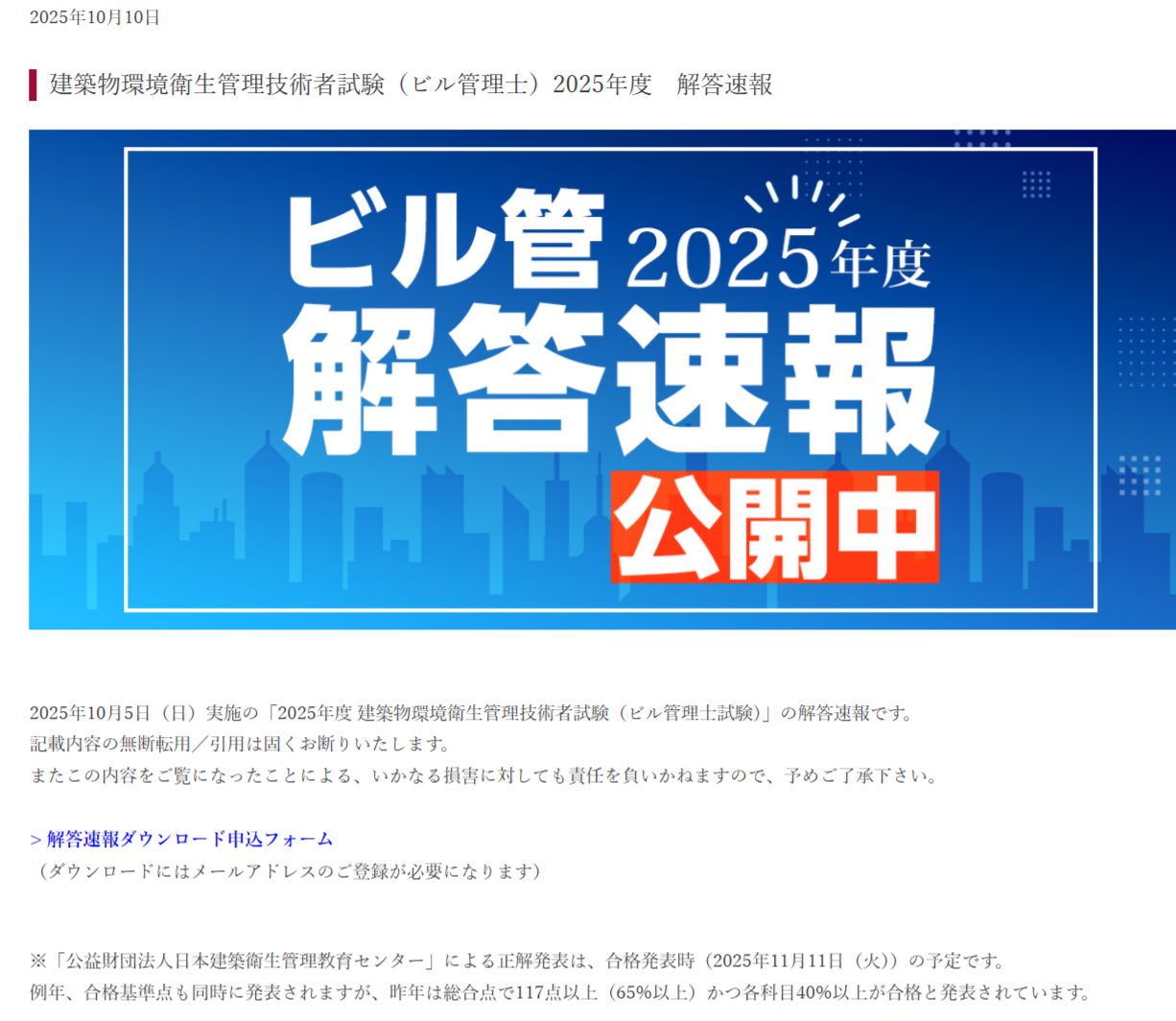 「2025年度 建築物環境衛生管理技術者試験(ビル管理士試験)」の解答速報。