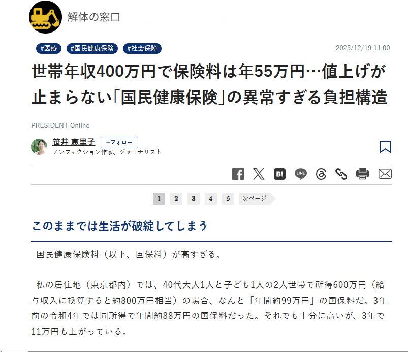 私の居住地(東京都内)では、40代大人1人と子ども1人の2人世帯で所得600万円(給与収入に換算すると約800万円相当)の場合、なんと「年間約99万円」の国保料だ。3年前の令和4年では同所得で年間約88万円の国保料だった。