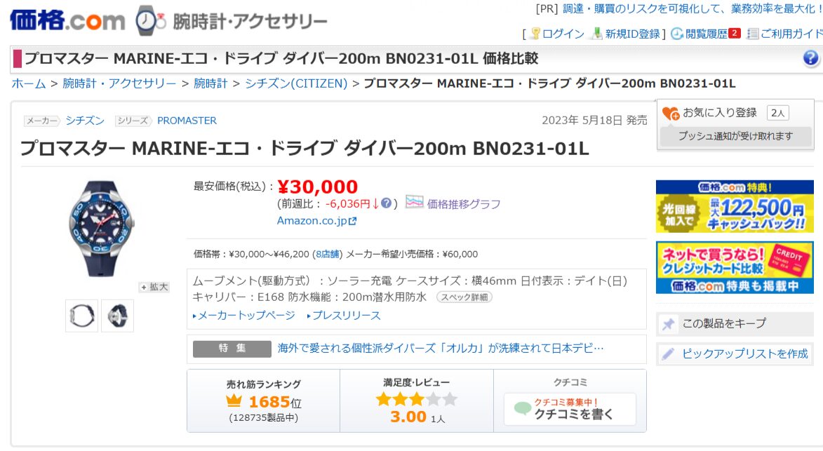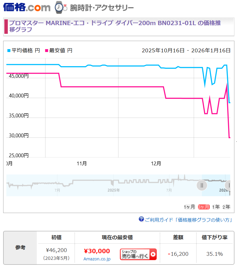 小まめに検索するとこんなこともあるんですね。プロマスター MARINE-エコ・ドライブ ダイバー200m BN0231-01L